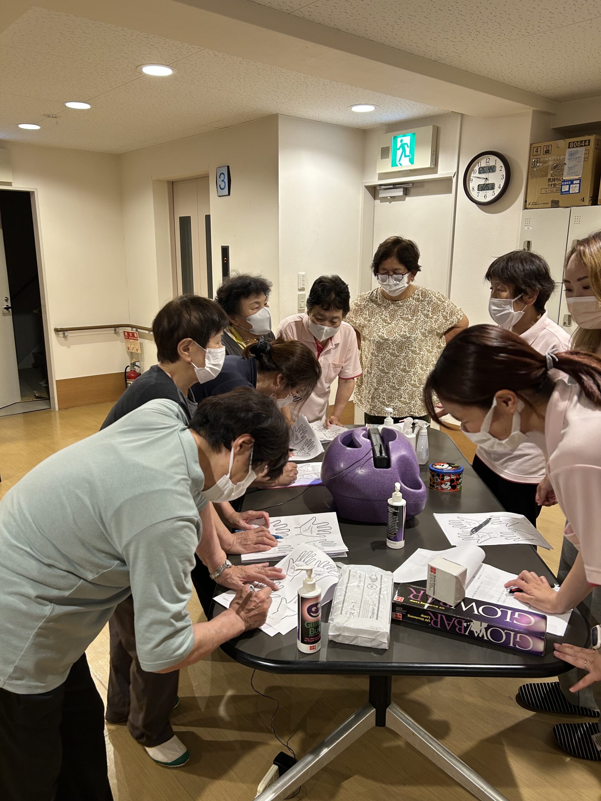 手洗いの実習では疑似の汚れとして蛍光塗料を使い、手洗い後にブラックライトで手の汚れを可視化する実習を行いました。