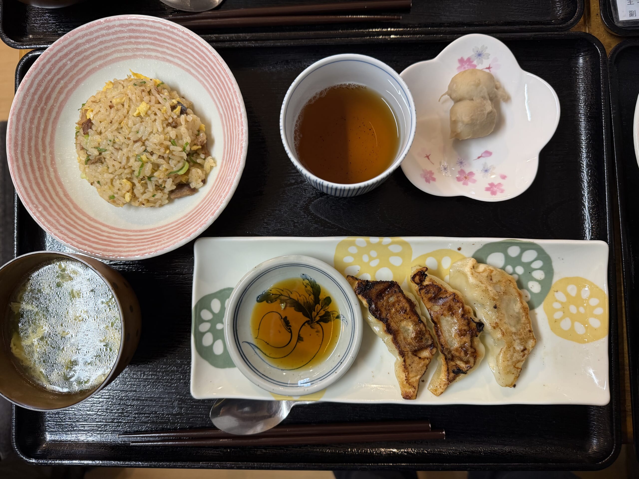 みんな大好きな、とある老舗の餃子と所長特製の炒飯&中華スープでした。